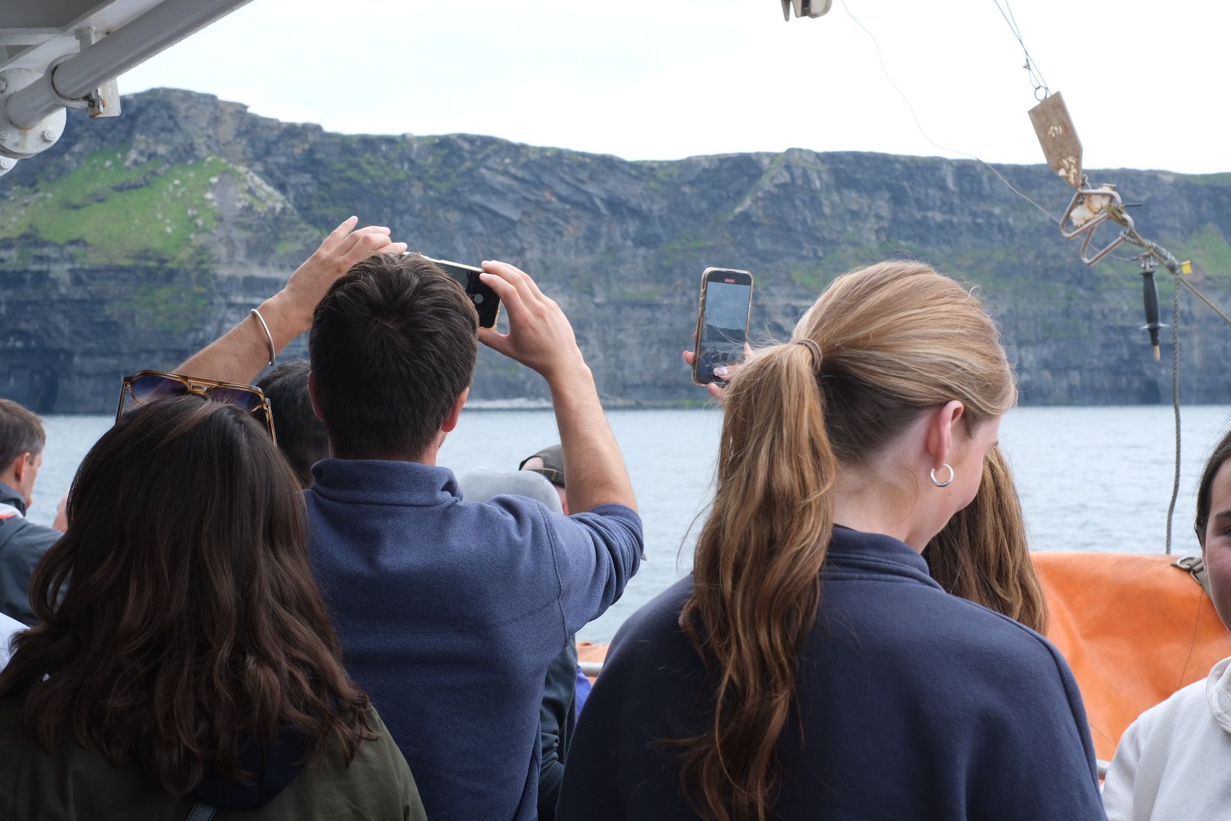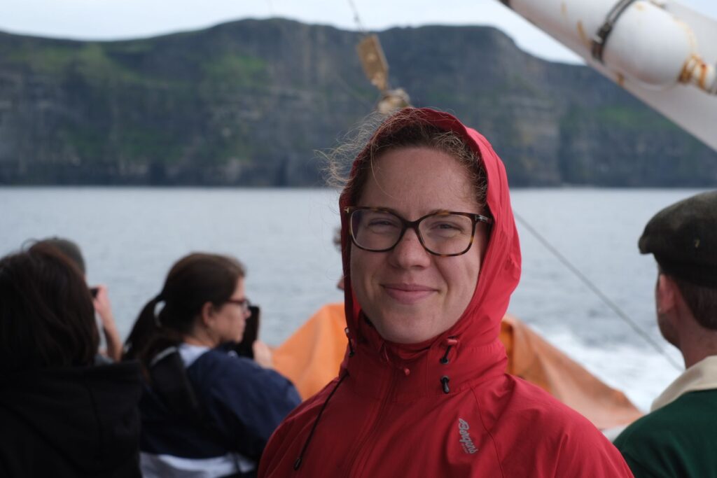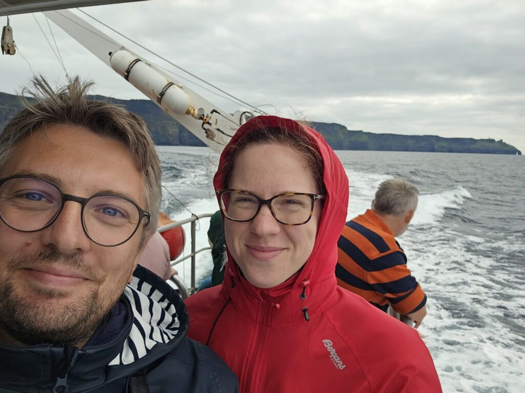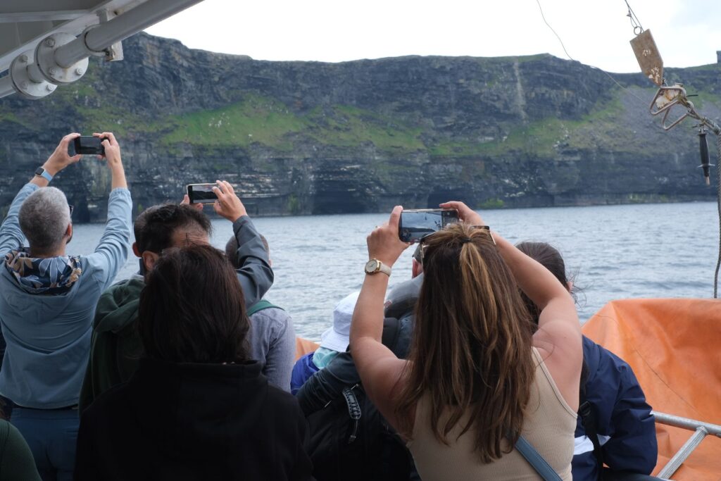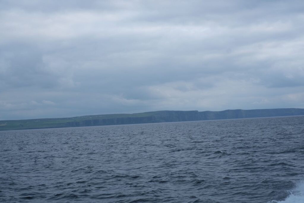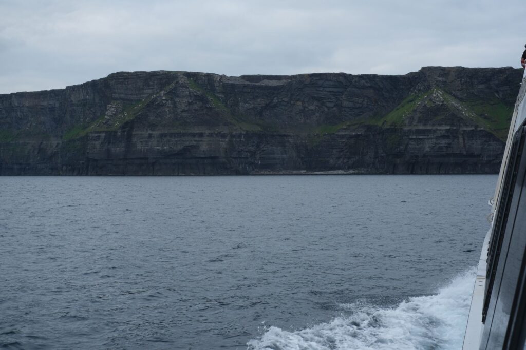 Dann wieder Boarding und ab zu den Cliffs of Moher, für viele am Boot sicherlich das Highlight des Ausflugs. Und man muss sagen, die Klippen sind auch unglaublich beeindruckend. Sie ragen an vielen Stellen nahezu senkrecht aus dem Atlantischen Ozean und erstrecken sich über mehr als acht Kilometer. Am Südende, dem Hag’s Head, haben sie eine Höhe von ungefähr 120 m, nördlich des O’Brien’s Tower erreichen sie sogar 214 m. Unglaublich! Für die Freund*innen der Popkultur, auch hier wieder eine Referenz, denn insbesondere die Fans der Harry Potter Filme werden den Ort sicherlich sofort wiedererkennen, der in Teil 6 „Harry Potter und der Halbblutprinz“ teil der Horcrux-Suche ist 😉.