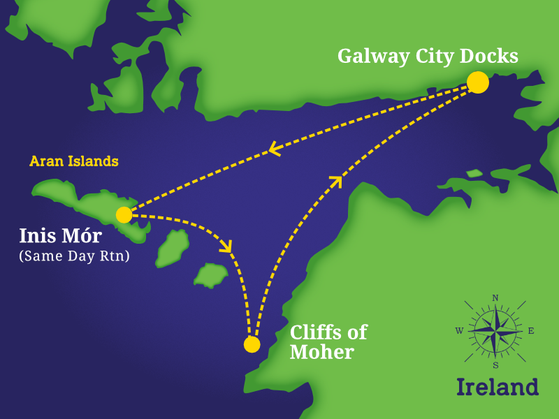 Galway liegt dafür ideal, denn einerseits befinden sich die malerischen Aran-Islands vor der Küste, sowie die berühmteste Sehenswürdigkeiten Irlands etwas südwärts, die Cliffs of Moher.
